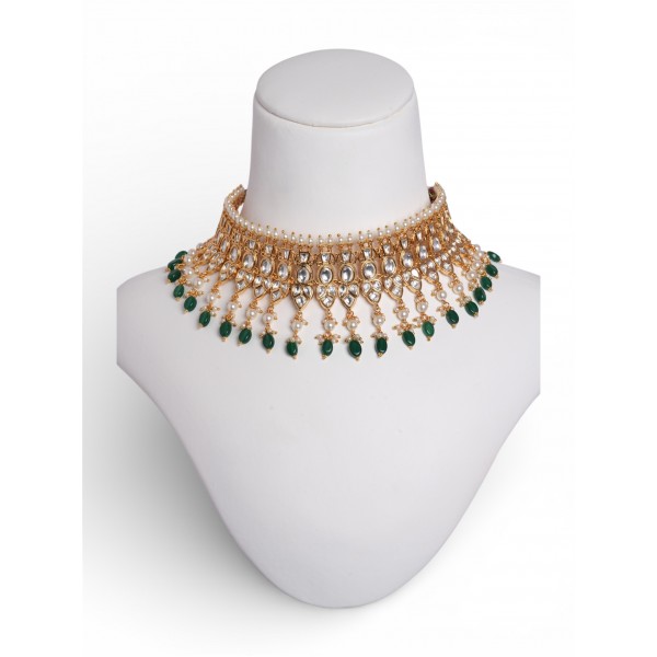 This Kundan Meenakari neckpiece with creamy pearls fusion in green is something which is a heavenly combination. It also has a divinely beautiful kundan meenakari earrings. This choker set could be worn with different outfits like sari,punjabi and pakistani suits,lehenga etc. Jewellery care tips: